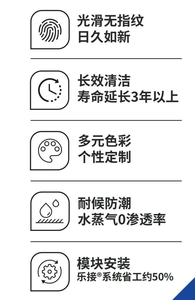 抗指紋系列鋁復(fù)合板表面具有防水防油防指紋附著,使表面光滑等功能的特殊涂料,相比于普通鋁復(fù)合板,表面更不易污染,可長效保持板面清潔,降低清潔頻次,延長使用壽命3年以上,具有