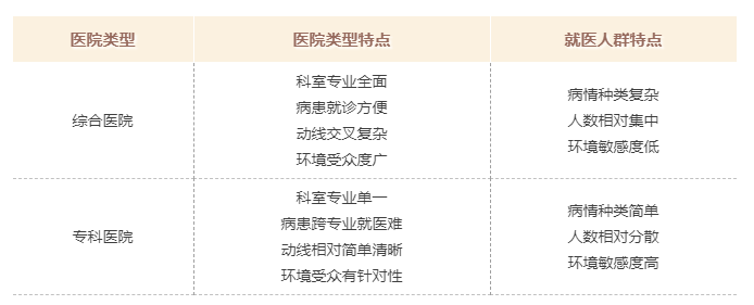 不同的醫院類型在就醫人群和醫院整體設計上有著不同的特征,但是由于運維管理、室內設計等多方面的原因,很多患者出現在綜合醫院看病流程繁瑣、醫院環境惡劣的就醫體驗,而專科醫院雖然相對就醫環境較好,但高價格也給老百姓造成了心理壓力。