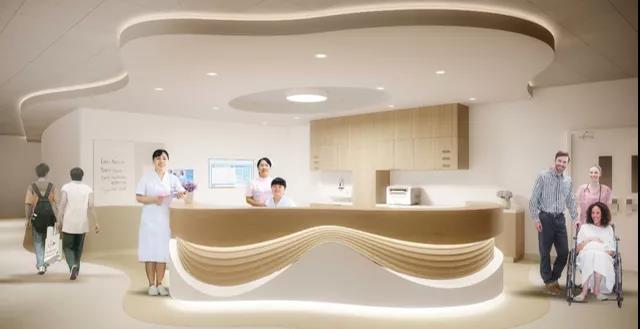 科室空間要根據科室的功能需求進行設計,在護士站要設置母嬰室、陪護等候區、直飲水區;在產科、病房的選材、選色和燈光設計上盡量家庭化,還宜設置愛屋、母嬰同室等,而手續辦理區域宜使用木色HPL板營造溫馨環境;在骨科病房及病人長期仰臥的病房內,要注意避免強炫光設計,液晶電視進行懸掛,適合臥床觀看;在兒保區域優化等候區,可以增設投影墻或互動屏,通過影像互動吸引兒童注意力,消除緊張情緒;在老年人、殘疾人或心腦血管康復病人的病房及其衛生間內,應距地面H=300MM高處各增設1-2處緊急呼叫(帶紅繩)鈕作為呼叫系統的補充和完善。