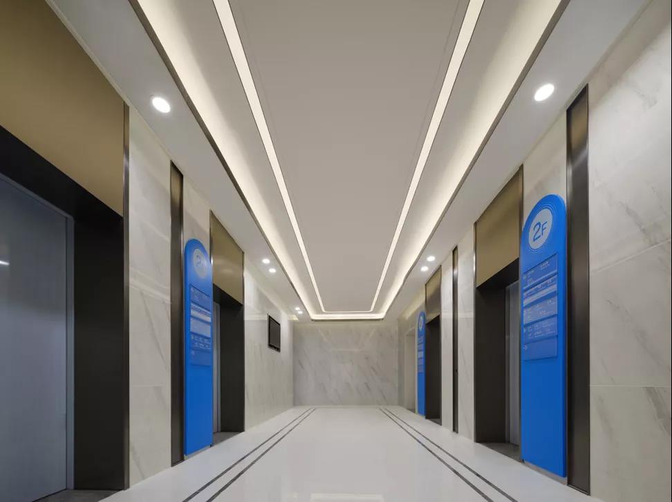 ▲ 圖45 人性化/專業化/尊貴化:醫技樓電梯廳采用易于引導標識系統、防炫光暗藏燈光、采用石材和不銹鋼材質品質,體現空間品質感特性