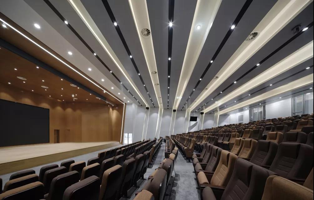 ▲ 圖51 專業化/尊貴化:綜合樓報告廳采用線性燈光氛圍、主舞臺采用木色色調