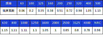 吸聲頻帶寬、低頻吸聲效果更佳;在100~5000HZ內(nèi)平均吸聲系數(shù)0.84以上;降噪系數(shù)NRC達到0.98。